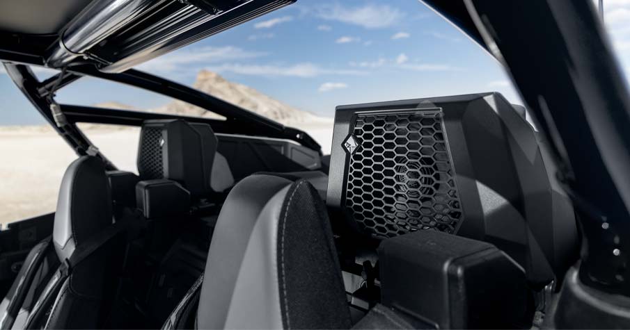 Système audio Rockford Fosgate Stage 4 réglé en usine et intégré avec unité source RIDE COMMAND. Comprend (1) amplificateur numérique 8 canaux de 1 500 W, (2) tweeters 100 W 1 po, (2) haut-parleurs avant 100 W 6,5 po, (2) haut-parleurs arrière coaxiaux 100 W 6,5 po et (1) caisson de graves 10 po. *Le système audio est certifié IPX7 et IPX9K pour résister à l'immersion dans l'eau.
